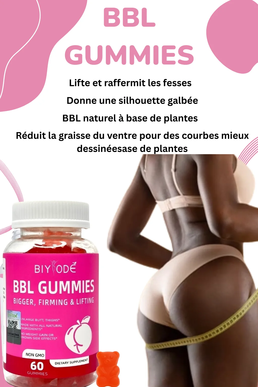 Avec les BBL Gummies, tu gagnes en galbe, en confiance et en féminité, sans chirurgie ni produits chimiques. Faciles à prendre (2 gummies par jour), ils t’accompagnent au quotidien pour des résultats visibles et naturels.